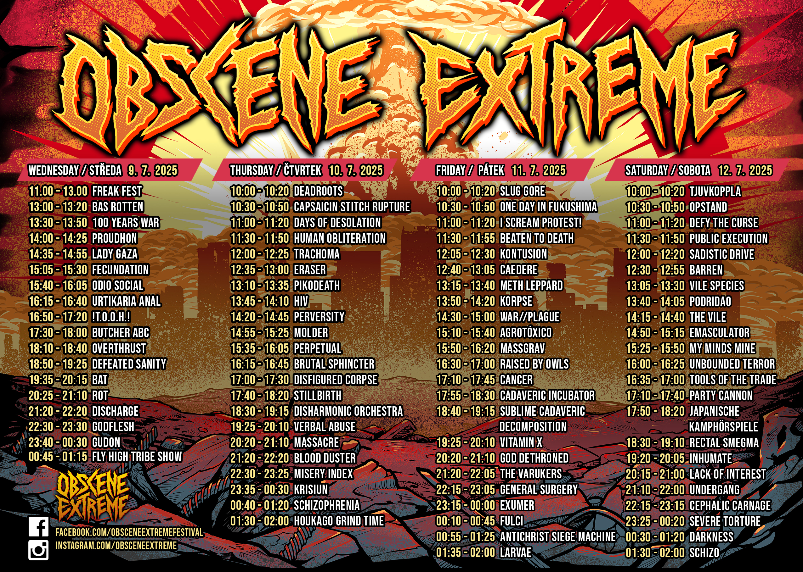 Program a informace ke kapelám, najdete tady: www.obsceneextreme.cz/cs/program.