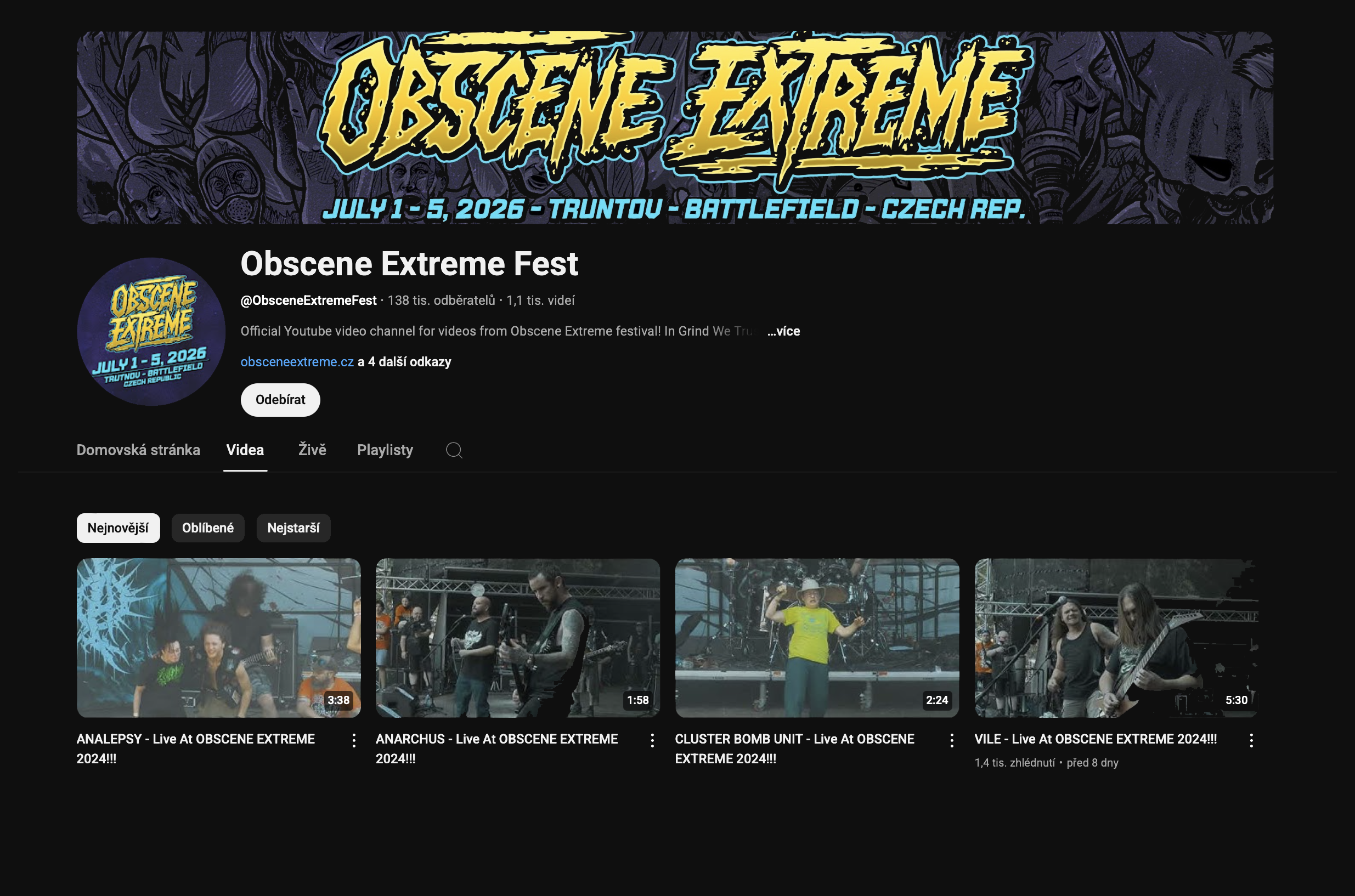 Každý den nasazujeme videa v 17.00. Oživte svoje vzpomínky a sledujte nás na YOUTUBE: https://www.youtube.com/@ObsceneExtremeFest!!!